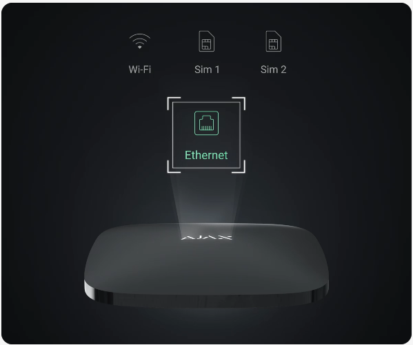 Hub 2 Plus needs Internet access to connect to the Ajax Cloud service. The central unit is connected to the Internet via Ethernet, Wi-Fi, and two SIM cards (2G/3G/4G).